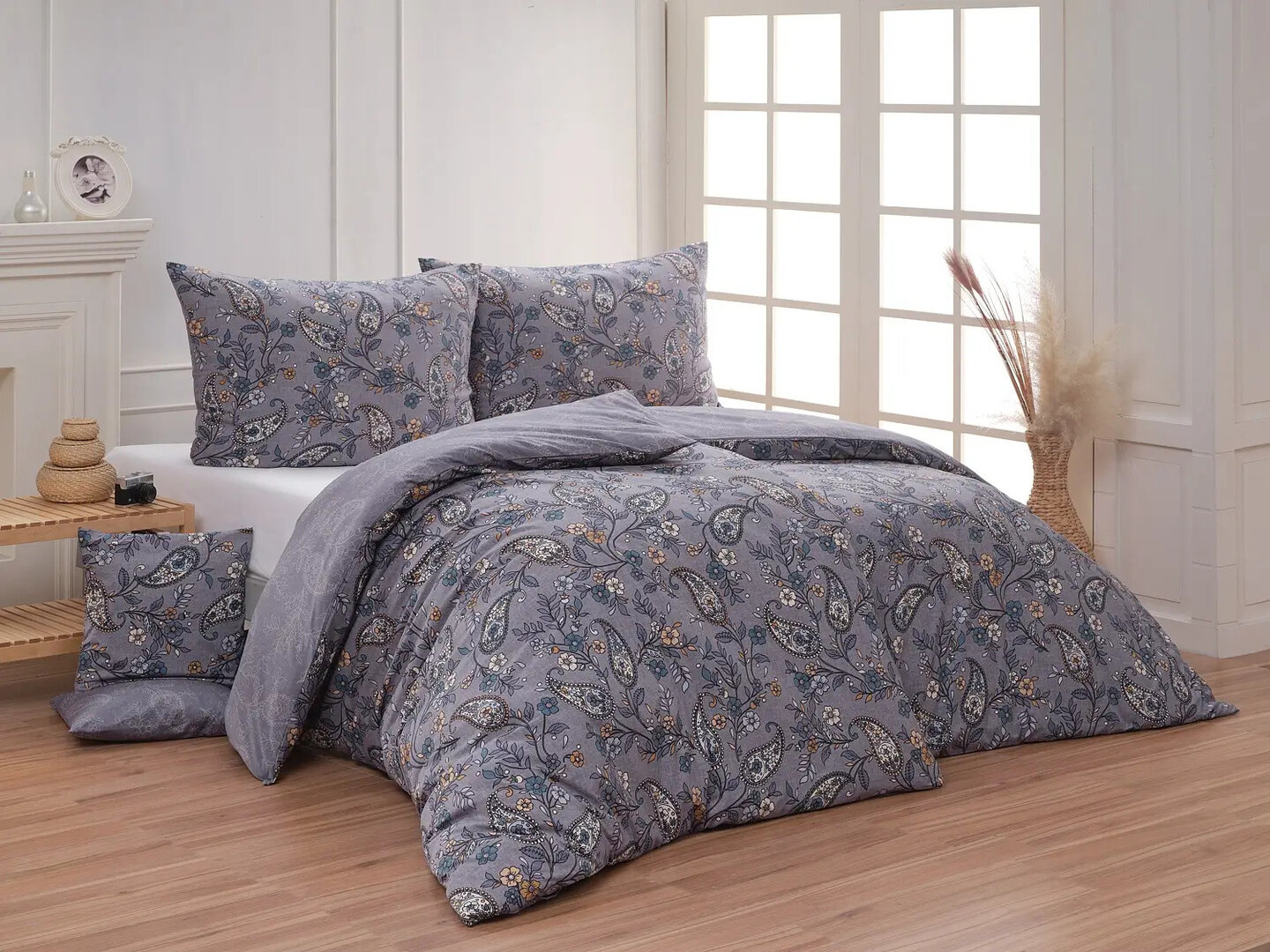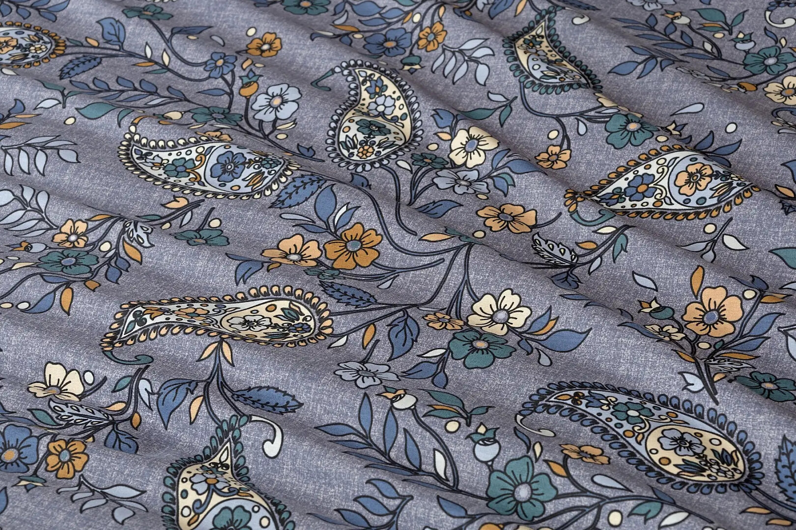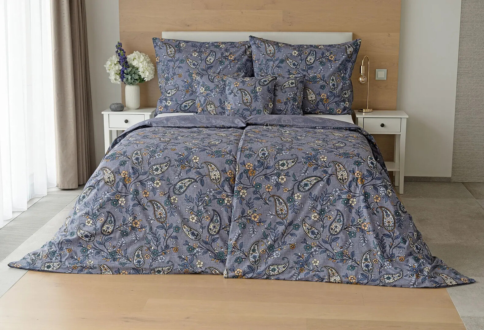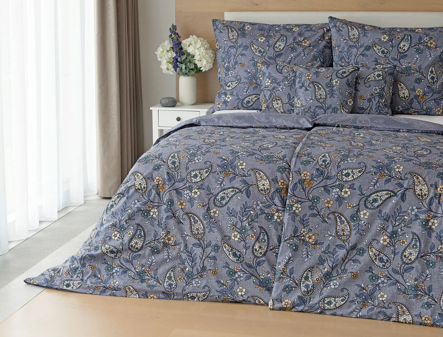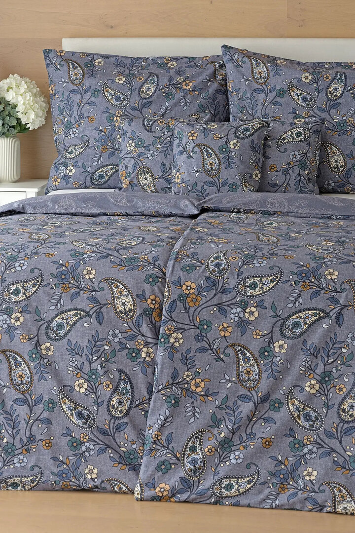 Půvabný paisley vzor je na vrchní straně povlečení barevný, snoubí se v něm odstíny modré, petrolejové, béžové a meruňkové barvy. Na spodní straně je vzor zanesen do modrého podkladu pouze v jemných bílých konturách. Díky tomuto oboustrannému provedení si užijete hravé stlaní.